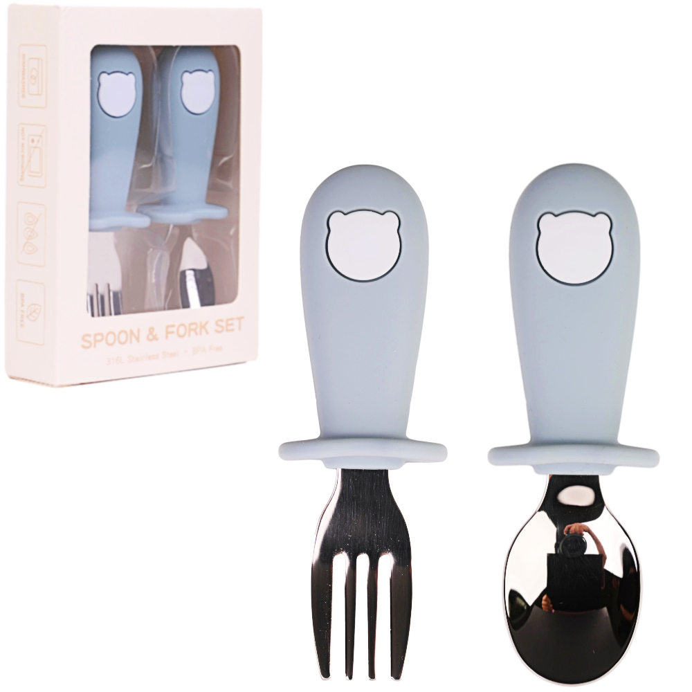 Set tacamuri pentru bebelusi si copii Babysnugg, furculita si lingurita din silicon si otel inoxidabil, Albastru